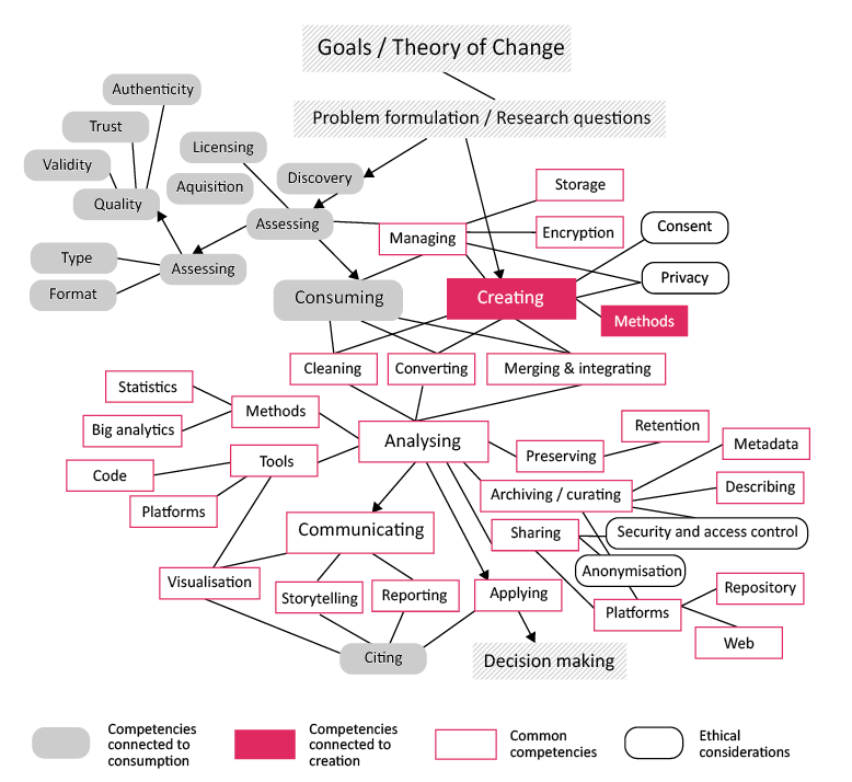Matthews8offers a catalogue of core competencies (see Figure 1) discussed across different sources on data literacy, highlighting the mix of capacities required related to data consumption, data creation, and data ethics, as well as a broad range of common competencies needed to manage data. Work on “open” data literacy has tended to focus more specifically on skills relating to data discovery and acquisition, data cleaning, and working with data in open data formats (CSV, JSON, etc.), using a particular set of common open data tools, as well as data visualisation, presentation, and storytelling. There is a further challenge for open data literacy in that the landscape of data availability, digital tools, analytical methods, and linkability between datasets is rapidly evolving. Moreover, understanding the significance of the term “open” when applied to data literacy implies an additional set of competencies and skills that focus on interoperability. Work on open data literacy in general aims to promote an understanding of, and commitment to, openness.