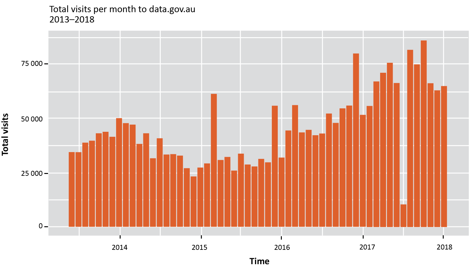 In Australia, a similar upward trend emerges over time (see Figure 3), providing an encouraging sign that more citizens are taking advantage of the portal. However, as with the US data, examining publisher popularity on data.gov.au shows that visits are dominated by a small handful of agencies. Datasets published by the Department of Human Services alone account for 47% of all visits to the site since 2013, and the ten most popular publishers account for 84% of total visits. By far, the most popular resources on data.gov.au are a small sample of location search resources, with the locations of Medicare offices accounting for 27% of total historical visits and the Location of Centrelink Offices accounting for another 14%. Essentially, two out of 70 000 datasets account for 41% of all visits. The distribution of downloads rather than visits is slightly less skewed toward the most popular resources, with the ten most popular datasets accounting for about 54% of visits, but only 21% of downloads.